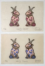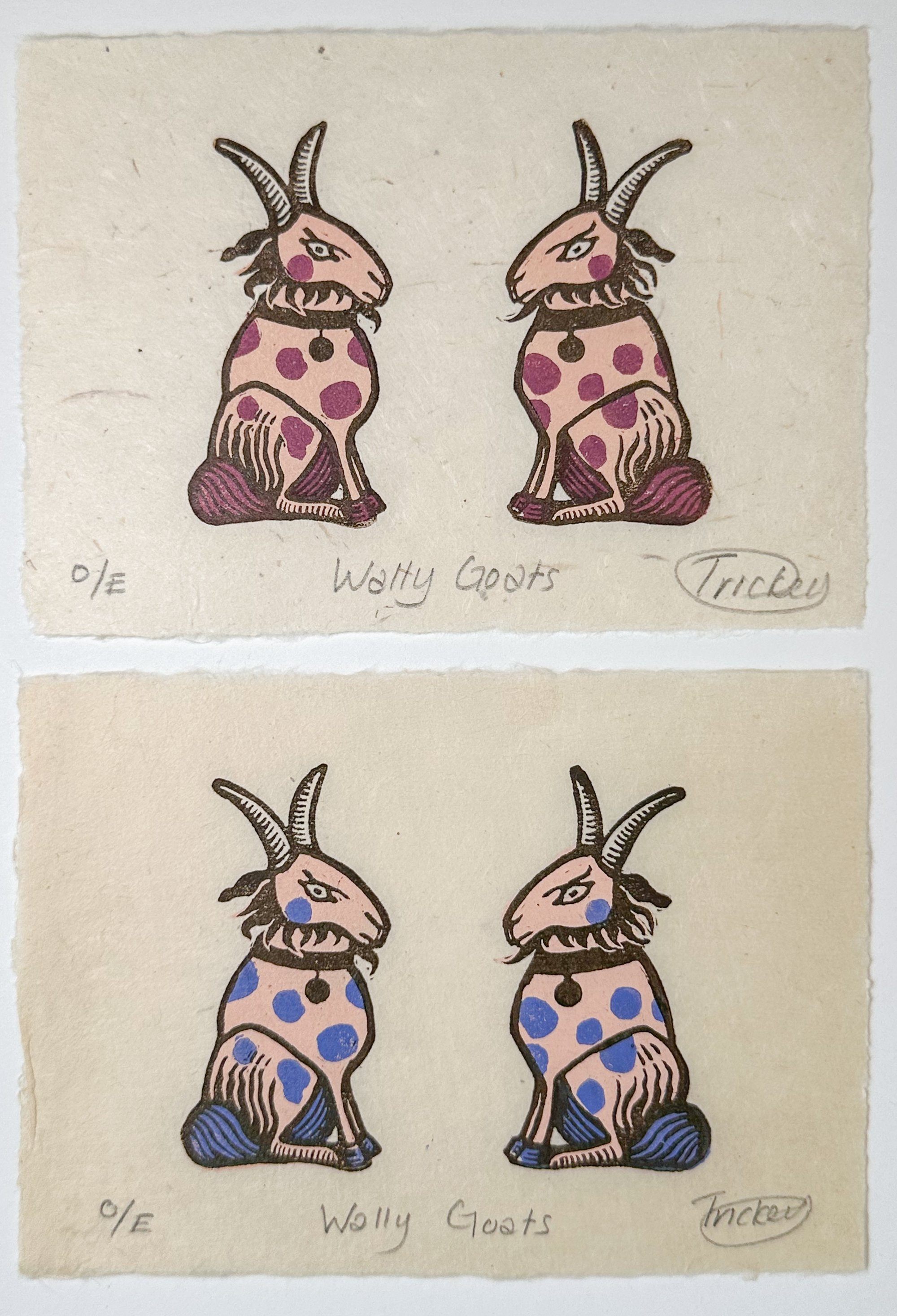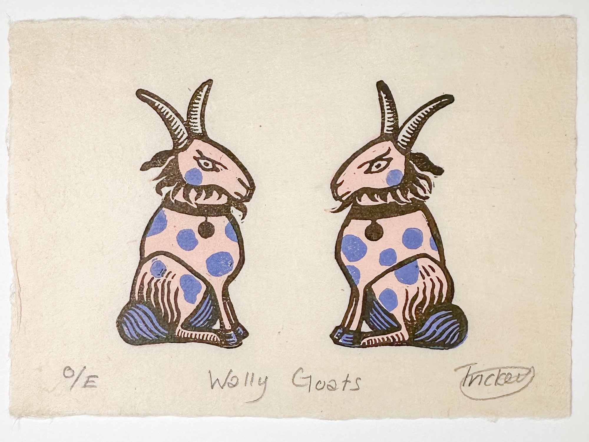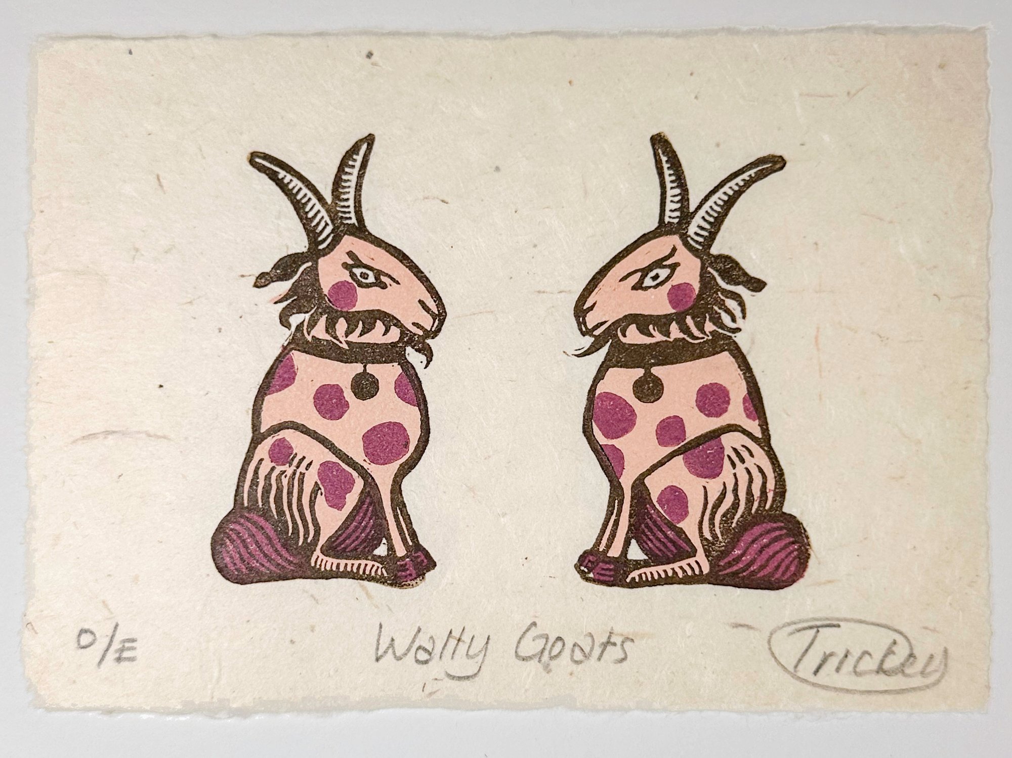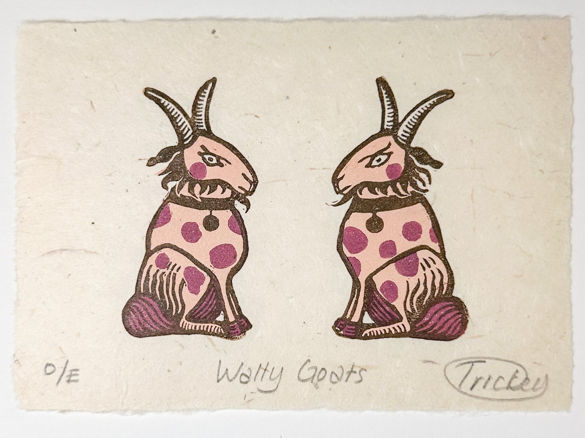 Open edition two colour lino print in either pink/purple or pink/blue ink on 100 gsm nepalese handmade paper and measuring roughly 15 x 10.5cm or A6.